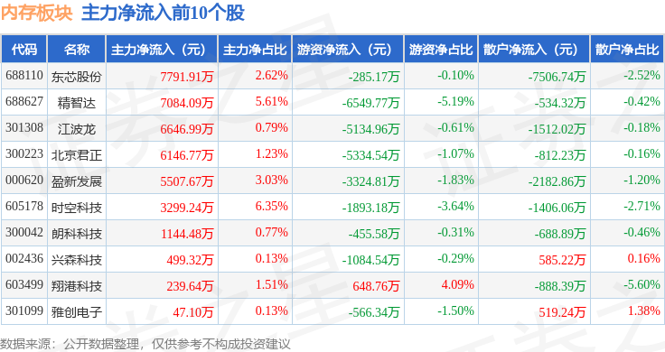 从资金流向上来看,当日内存板块主力资金净流出91.68亿元,游资资金净流入28.43亿元,散户资金净流入63.24亿元。内存板块个股资金流向见下表: