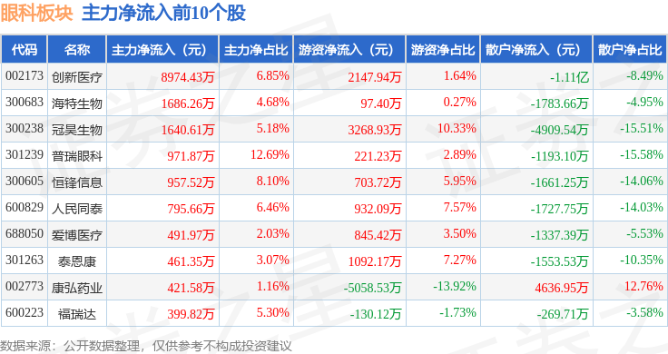 从资金流向上来看,当日眼科板块主力资金净流出9.9亿元,游资资金净流入1.74亿元,散户资金净流入8.16亿元。眼科板块个股资金流向见下表: