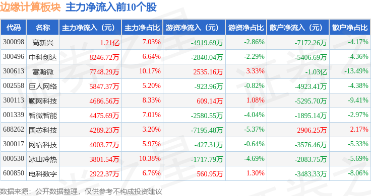 从资金流向上来看,当日边缘计算板块主力资金净流出12.66亿元,游资资金净流入6.17亿元,散户资金净流入6.49亿元。边缘计算板块个股资金流向见下表: