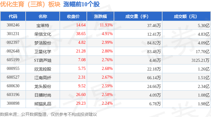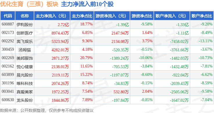 从资金流向上来看,当日优化生育(三孩)板块主力资金净流出2.17亿元,游资资金净流入2695.26万元,散户资金净流入1.9亿元。优化生育(三孩)板块个股资金流向见下表: