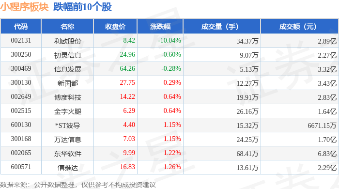 证券之星消息,1月22日小程序板块较上一交易日下跌2.43%,利欧股份领跌。当日上证指数报收于4122.58,上涨0.14%。深证成指报收于14327.05,上涨0.5%。小程序板块个股涨跌见下表: