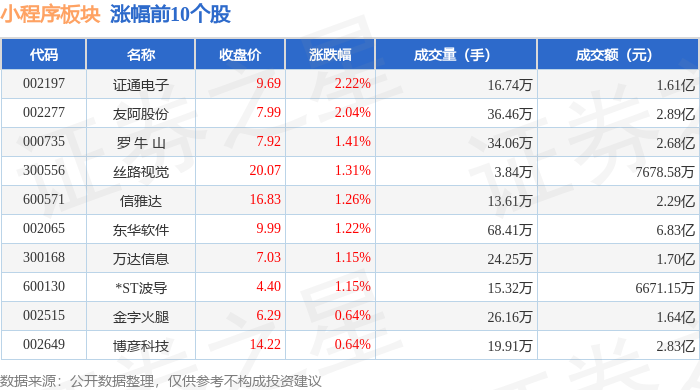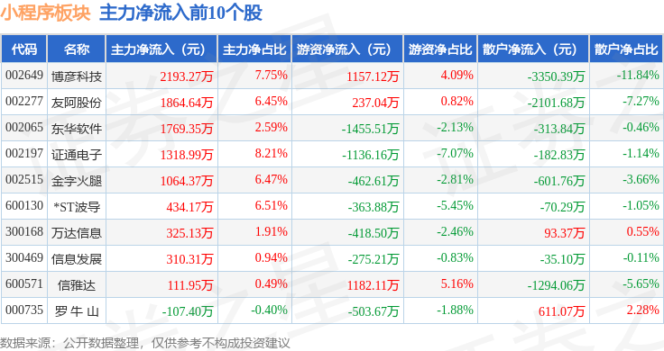 从资金流向上来看,当日小程序板块主力资金净流出1.22亿元,游资资金净流入4635.32万元,散户资金净流入7539.24万元。小程序板块个股资金流向见下表: