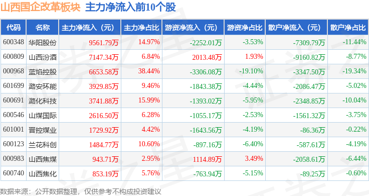 从资金流向上来看,当日山西国企改革板块主力资金净流入2.8亿元,游资资金净流出7319.35万元,散户资金净流出2.07亿元。山西国企改革板块个股资金流向见下表: