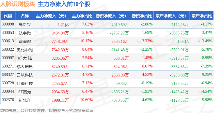 从资金流向上来看,当日人脸识别板块主力资金净流出1203.51万元,游资资金净流出6228.54万元,散户资金净流入7432.05万元。人脸识别板块个股资金流向见下表: