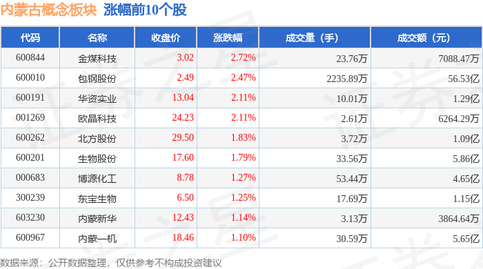 从资金流向上来看,当日内蒙古概念板块主力资金净流出9.29亿元,游资资金净流入4.23亿元,散户资金净流入5.07亿元。内蒙古概念板块个股资金流向见下表: