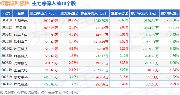 从资金流向上来看,当日虹膜识别板块主力资金净流出9.9亿元,游资资金净流入1.74亿元,散户资金净流入8.16亿元。虹膜识别板块个股资金流向见下表: