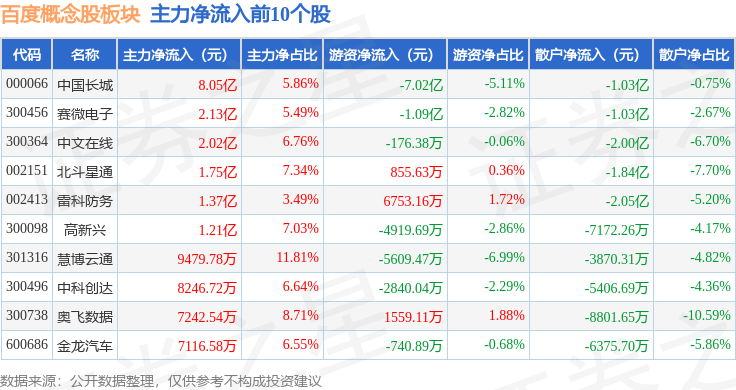 从资金流向上来看,当日百度概念股板块主力资金净流出14.85亿元,游资资金净流入1.31亿元,散户资金净流入13.54亿元。百度概念股板块个股资金流向见下表: