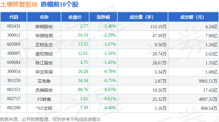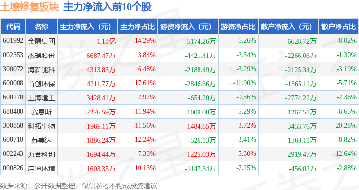 从资金流向上来看,当日土壤修复板块主力资金净流入1.13亿元,游资资金净流出2.33亿元,散户资金净流入1.2亿元。土壤修复板块个股资金流向见下表: