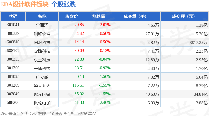 从资金流向上来看,当日EDA设计软件板块主力资金净流出5.1亿元,游资资金净流入2.29亿元,散户资金净流入2.81亿元。EDA设计软件板块个股资金流向见下表: