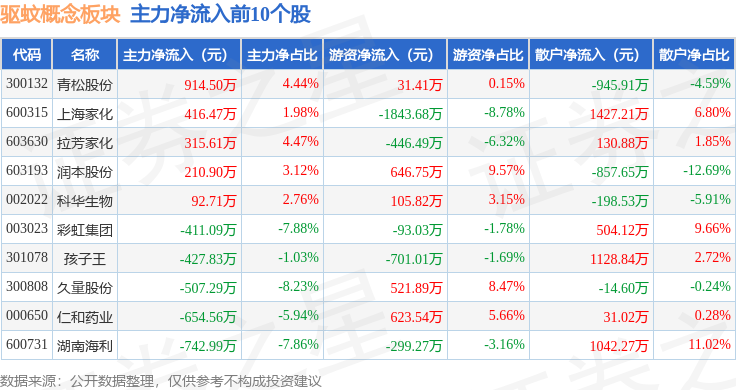 从资金流向上来看,当日驱蚊概念板块主力资金净流出1.23亿元,游资资金净流入1817.42万元,散户资金净流入1.05亿元。驱蚊概念板块个股资金流向见下表: