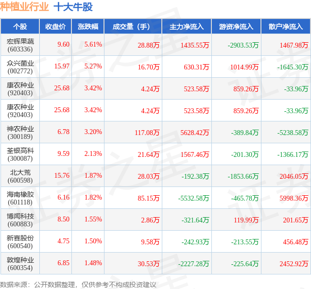 个股表现方面,种植业行业当日领涨股为宏辉果蔬(603336),该股当日报收9.6,上涨5.61%,成交量28.88万,主力资金净流入1435.55万元。众兴菌业(002772)以上涨5.27%紧随其后,该股当日成交量16.7万,主力资金净流入630.31万元。除此之外,康农种业(920403)、康农种业(920403)、神农种业(300189)均进入当日牛股之列。具体个股列表见下表: