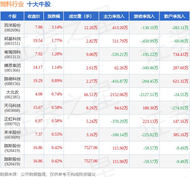 个股表现方面,饲料行业当日领涨股为百洋股份(002696),该股当日报收7.88,上涨3.14%,成交量12.2万,主力资金净流入413.2万元。邦基科技(603151)以上涨1.77%紧随其后,该股当日成交量2.82万,主力资金净流入511.79万元。除此之外,粤海饲料(001313)、播恩集团(001366)、路德科技(688156)均进入当日牛股之列。具体个股列表见下表:
