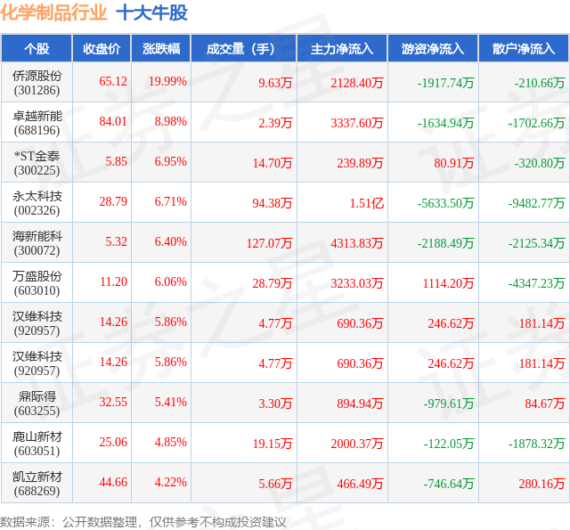 个股表现方面,化学制品行业当日领涨股为侨源股份(301286),该股当日报收65.12,上涨19.99%,成交量9.63万,主力资金净流入2128.4万元。卓越新能(688196)以上涨8.98%紧随其后,该股当日成交量2.39万,主力资金净流入3337.6万元。除此之外,*ST金泰(300225)、永太科技(002326)、海新能科(300072)均进入当日牛股之列。具体个股列表见下表: