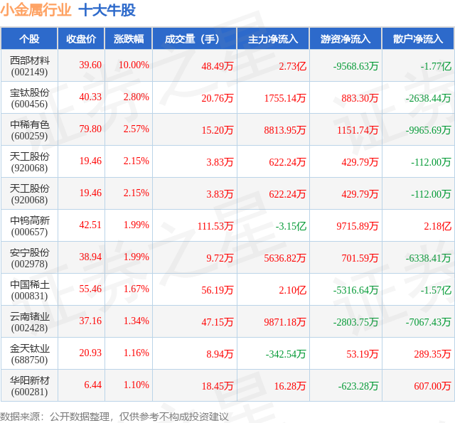 个股表现方面,小金属行业当日领涨股为西部材料(002149),该股当日报收39.6,上涨10.0%,成交量48.49万,主力资金净流入2.73亿元。宝钛股份(600456)以上涨2.8%紧随其后,该股当日成交量20.76万,主力资金净流入1755.14万元。除此之外,中稀有色(600259)、天工股份(920068)、天工股份(920068)均进入当日牛股之列。具体个股列表见下表: