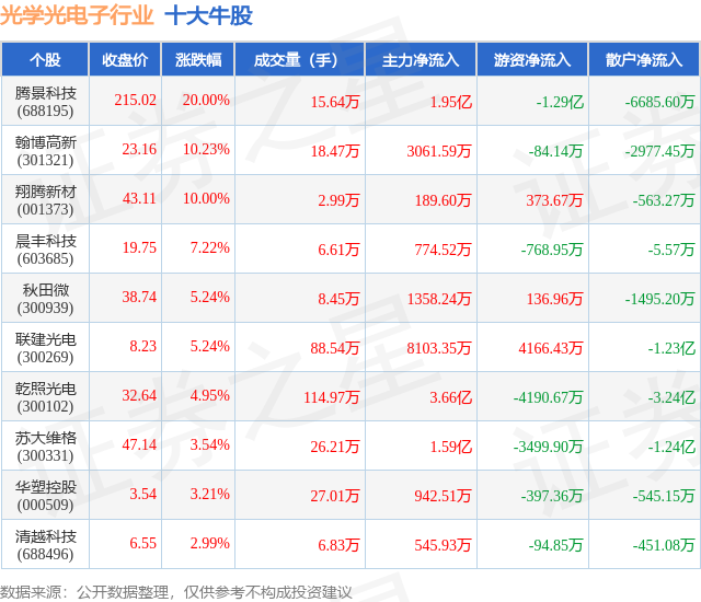 个股表现方面,光学光电子行业当日领涨股为腾景科技(688195),该股当日报收215.02,上涨20.0%,成交量15.64万,主力资金净流入1.95亿元。翰博高新(301321)以上涨10.23%紧随其后,该股当日成交量18.47万,主力资金净流入3061.59万元。除此之外,翔腾新材(001373)、晨丰科技(603685)、秋田微(300939)均进入当日牛股之列。具体个股列表见下表:
