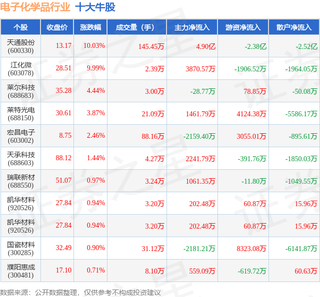 个股表现方面,电子化学品行业当日领涨股为天通股份(600330),该股当日报收13.17,上涨10.03%,成交量145.45万,主力资金净流入4.9亿元。江化微(603078)以上涨9.99%紧随其后,该股当日成交量2.39万,主力资金净流入3870.57万元。除此之外,莱尔科技(688683)、莱特光电(688150)、宏昌电子(603002)均进入当日牛股之列。具体个股列表见下表: