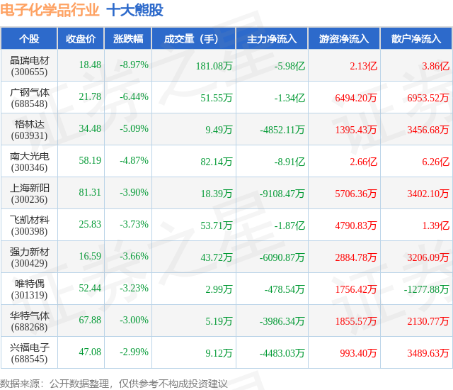 个股表现方面,电子化学品行业当日领跌股为晶瑞电材(300655),该股当日报收18.48,下跌8.97%,成交量181.08万,主力资金净流出5.98亿元。广钢气体(688548)以下跌6.44%紧随其后,该股当日成交量51.55万,主力资金净流出1.34亿元。除此之外,格林达(603931)、南大光电(300346)、上海新阳(300236)均进入当日熊股之列。具体个股列表见下表:
