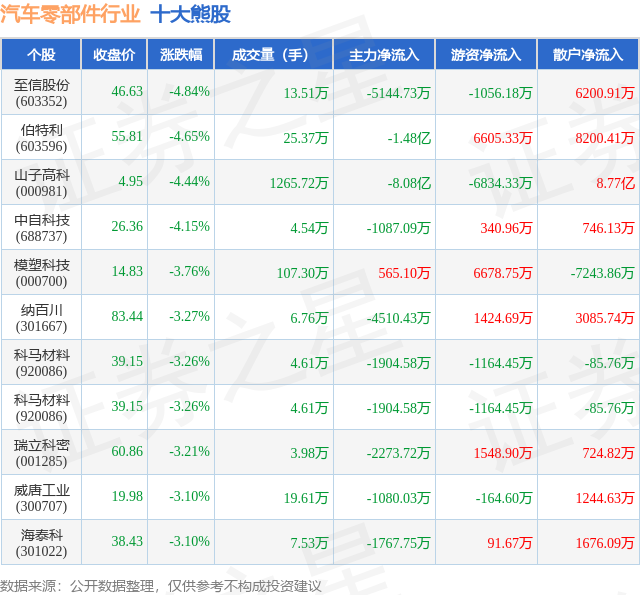 个股表现方面,汽车零部件行业当日领跌股为至信股份(603352),该股当日报收46.63,下跌4.84%,成交量13.51万,主力资金净流出5144.73万元。伯特利(603596)以下跌4.65%紧随其后,该股当日成交量25.37万,主力资金净流出1.48亿元。除此之外,山子高科(000981)、中自科技(688737)、模塑科技(000700)均进入当日熊股之列。具体个股列表见下表: