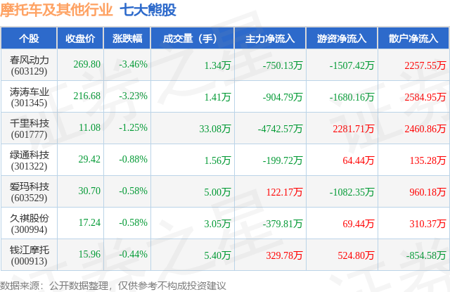 个股表现方面,摩托车及其他行业当日领跌股为春风动力(603129),该股当日报收269.8,下跌3.46%,成交量1.34万,主力资金净流出750.13万元。涛涛车业(301345)以下跌3.23%紧随其后,该股当日成交量1.41万,主力资金净流出904.79万元。除此之外,千里科技(601777)、绿通科技(301322)、爱玛科技(603529)均进入当日熊股之列。具体个股列表见下表: