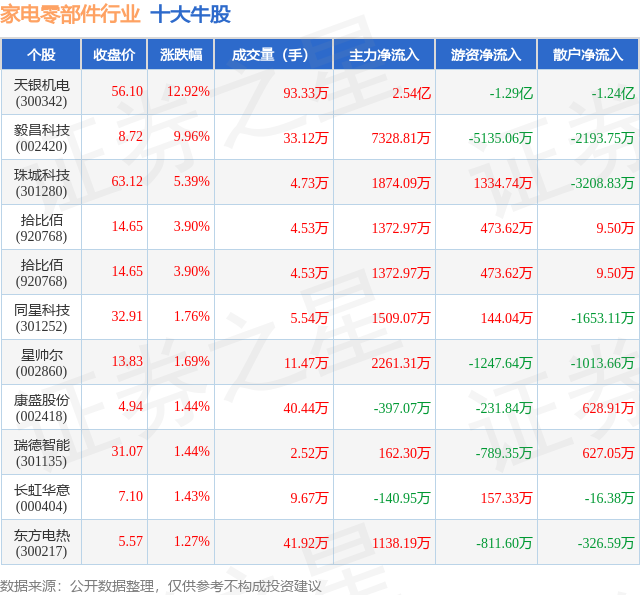 个股表现方面,家电零部件行业当日领涨股为天银机电(300342),该股当日报收56.1,上涨12.92%,成交量93.33万,主力资金净流入2.54亿元。毅昌科技(002420)以上涨9.96%紧随其后,该股当日成交量33.12万,主力资金净流入7328.81万元。除此之外,珠城科技(301280)、拾比佰(920768)、拾比佰(920768)均进入当日牛股之列。具体个股列表见下表: