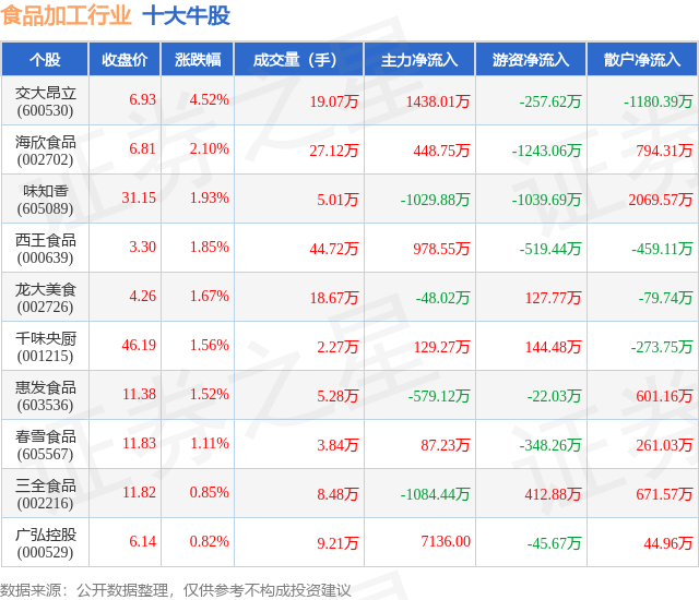 个股表现方面,食品加工行业当日领涨股为交大昂立(600530),该股当日报收6.93,上涨4.52%,成交量19.07万,主力资金净流入1438.01万元。海欣食品(002702)以上涨2.1%紧随其后,该股当日成交量27.12万,主力资金净流入448.75万元。除此之外,味知香(605089)、西王食品(000639)、龙大美食(002726)均进入当日牛股之列。具体个股列表见下表: