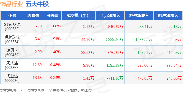 个股表现方面,饰品行业当日领涨股为ST新华锦(600735),该股当日报收6.2,上涨5.08%,成交量2.12万,主力资金净流入510.29万元。明牌珠宝(002574)以上涨1.91%紧随其后,该股当日成交量44.1万,主力资金净流出3229.36万元。除此之外,瑞贝卡(600439)、周大生(002867)、飞亚达(000026)均进入当日牛股之列。具体个股列表见下表: