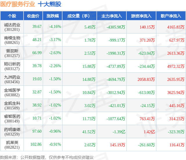 个股表现方面,医疗服务行业当日领跌股为诚达药业(301201),该股当日报收39.67,下跌4.16%,成交量5.49万,主力资金净流出4305.98万元。南模生物(688265)以下跌3.17%紧随其后,该股当日成交量1.78万,主力资金净流出999.17万元。除此之外,普蕊斯(301257)、昭衍新药(603127)、九洲药业(603456)均进入当日熊股之列。具体个股列表见下表:
