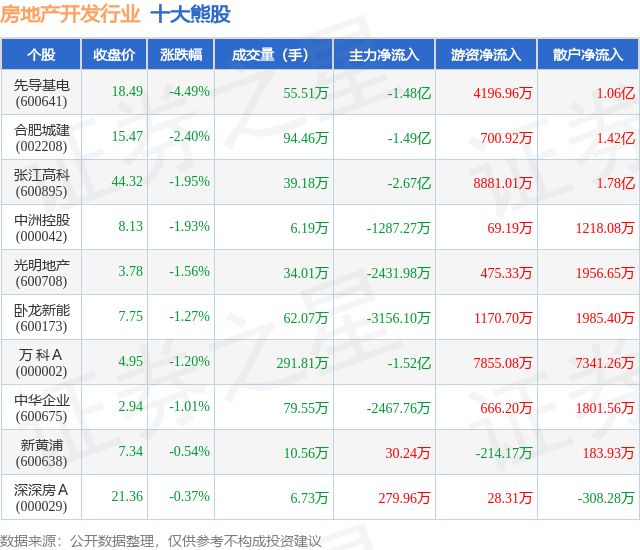 个股表现方面,房地产开发行业当日领跌股为先导基电(600641),该股当日报收18.49,下跌4.49%,成交量55.51万,主力资金净流出1.48亿元。合肥城建(002208)以下跌2.4%紧随其后,该股当日成交量94.46万,主力资金净流出1.49亿元。除此之外,张江高科(600895)、中洲控股(000042)、光明地产(600708)均进入当日熊股之列。具体个股列表见下表: