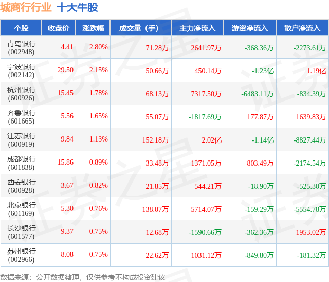 个股表现方面,城商行行业当日领涨股为青岛银行(002948),该股当日报收4.41,上涨2.8%,成交量71.28万,主力资金净流入2641.97万元。宁波银行(002142)以上涨2.15%紧随其后,该股当日成交量50.66万,主力资金净流入450.14万元。除此之外,杭州银行(600926)、齐鲁银行(601665)、江苏银行(600919)均进入当日牛股之列。具体个股列表见下表: