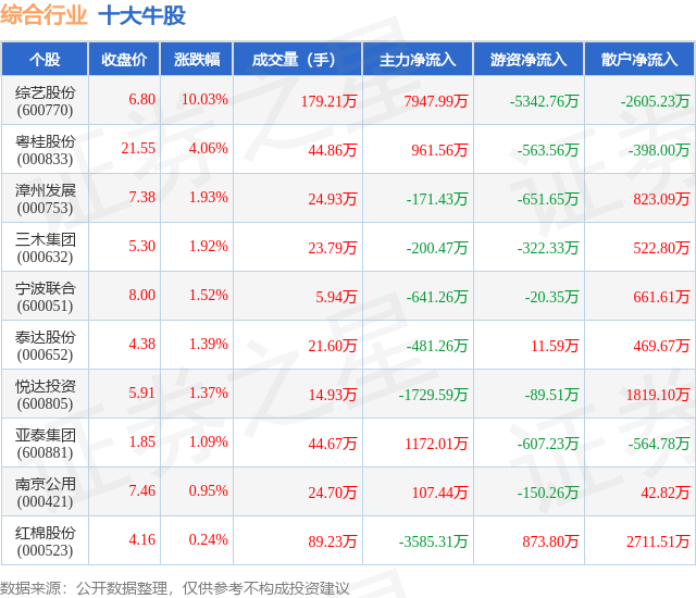 个股表现方面,综合行业当日领涨股为综艺股份(600770),该股当日报收6.8,上涨10.03%,成交量179.21万,主力资金净流入7947.99万元。粤桂股份(000833)以上涨4.06%紧随其后,该股当日成交量44.86万,主力资金净流入961.56万元。除此之外,漳州发展(000753)、三木集团(000632)、宁波联合(600051)均进入当日牛股之列。具体个股列表见下表: