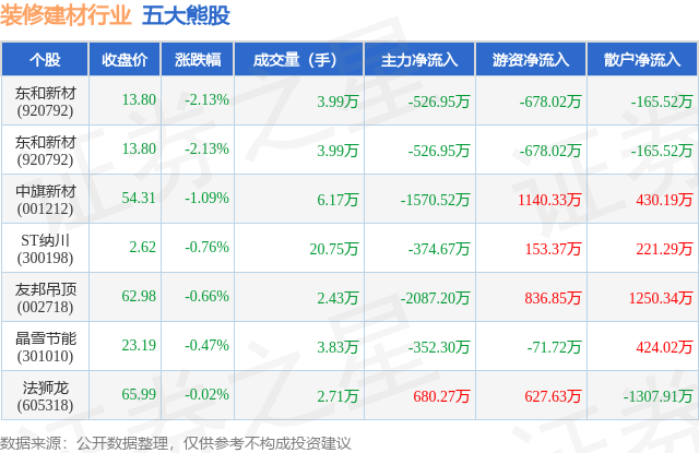 个股表现方面,装修建材行业当日领跌股为东和新材(920792),该股当日报收13.8,下跌2.13%,成交量3.99万,主力资金净流出526.95万元。东和新材(920792)以下跌2.13%紧随其后,该股当日成交量3.99万,主力资金净流出526.95万元。除此之外,中旗新材(001212)、ST纳川(300198)、友邦吊顶(002718)均进入当日熊股之列。具体个股列表见下表: