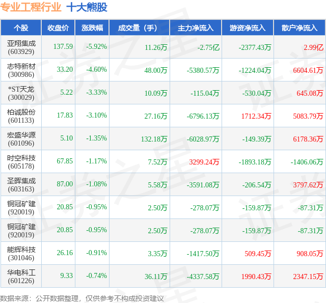 个股表现方面,专业工程行业当日领跌股为亚翔集成(603929),该股当日报收137.59,下跌5.92%,成交量11.26万,主力资金净流出2.75亿元。志特新材(300986)以下跌4.6%紧随其后,该股当日成交量48.0万,主力资金净流出5380.57万元。除此之外,*ST天龙(300029)、柏诚股份(601133)、宏盛华源(601096)均进入当日熊股之列。具体个股列表见下表: