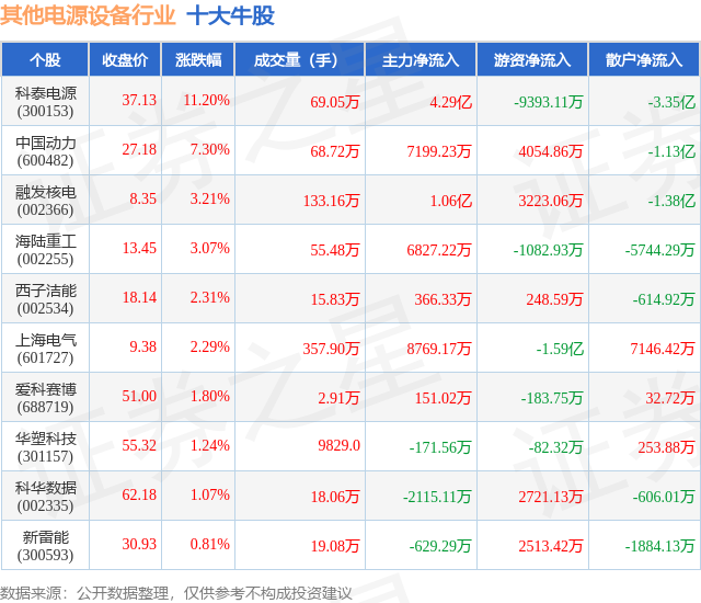 个股表现方面,其他电源设备行业当日领涨股为科泰电源(300153),该股当日报收37.13,上涨11.2%,成交量69.05万,主力资金净流入4.29亿元。中国动力(600482)以上涨7.3%紧随其后,该股当日成交量68.72万,主力资金净流入7199.23万元。除此之外,融发核电(002366)、海陆重工(002255)、西子洁能(002534)均进入当日牛股之列。具体个股列表见下表: