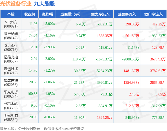 个股表现方面,光伏设备行业当日领跌股为ST京机(000821),该股当日报收11.96,下跌5.0%,成交量6.7万,主力资金净流出802.31万元。微导纳米(688147)以下跌4.16%紧随其后,该股当日成交量9.74万,主力资金净流入1368.35万元。除此之外,ST泉为(300716)、亿晶光电(600537)、赛伍技术(603212)均进入当日熊股之列。具体个股列表见下表: