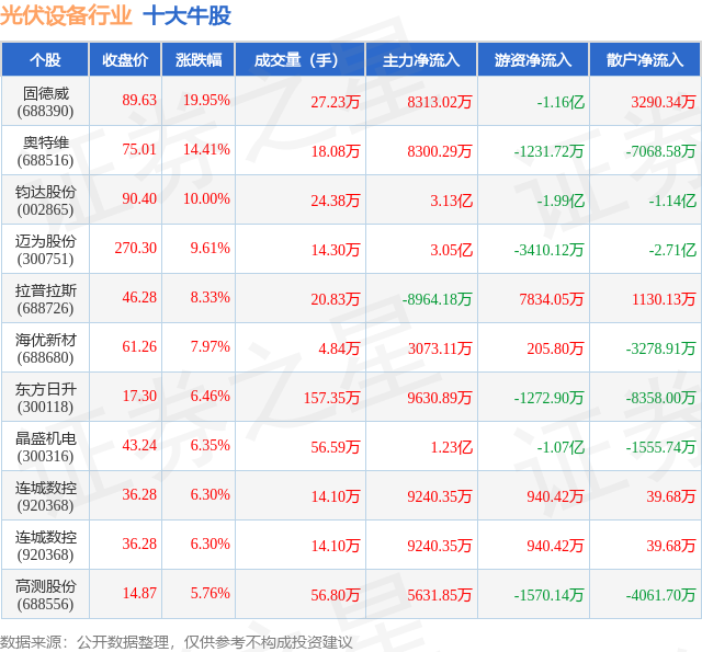 个股表现方面,光伏设备行业当日领涨股为固德威(688390),该股当日报收89.63,上涨19.95%,成交量27.23万,主力资金净流入8313.02万元。奥特维(688516)以上涨14.41%紧随其后,该股当日成交量18.08万,主力资金净流入8300.29万元。除此之外,钧达股份(002865)、迈为股份(300751)、拉普拉斯(688726)均进入当日牛股之列。具体个股列表见下表: