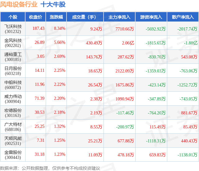个股表现方面,风电设备行业当日领涨股为飞沃科技(301232),该股当日报收187.43,上涨8.34%,成交量9.24万,主力资金净流入7710.66万元。金风科技(002202)以上涨5.66%紧随其后,该股当日成交量430.49万,主力资金净流入2.06亿元。除此之外,通裕重工(300185)、日月股份(603218)、中船科技(600072)均进入当日牛股之列。具体个股列表见下表: