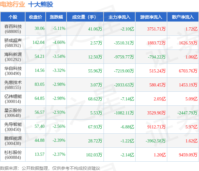 个股表现方面,电池行业当日领跌股为容百科技(688005),该股当日报收30.06,下跌5.11%,成交量41.06万,主力资金净流出2.1亿元。骄成超声(688392)以下跌4.66%紧随其后,该股当日成交量2.57万,主力资金净流出3510.31万元。除此之外,海科新源(301292)、华自科技(300490)、先惠技术(688155)均进入当日熊股之列。具体个股列表见下表: