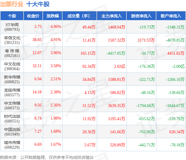 个股表现方面,出版行业当日领涨股为ST华闻(000793),该股当日报收2.75,上涨4.96%,成交量49.44万,主力资金净流入1468.04万元。荣信文化(301231)以上涨4.91%紧随其后,该股当日成交量12.41万,主力资金净流入1507.32万元。除此之外,粤 传 媒(002181)、中文在线(300364)、新华传媒(600825)均进入当日牛股之列。具体个股列表见下表: