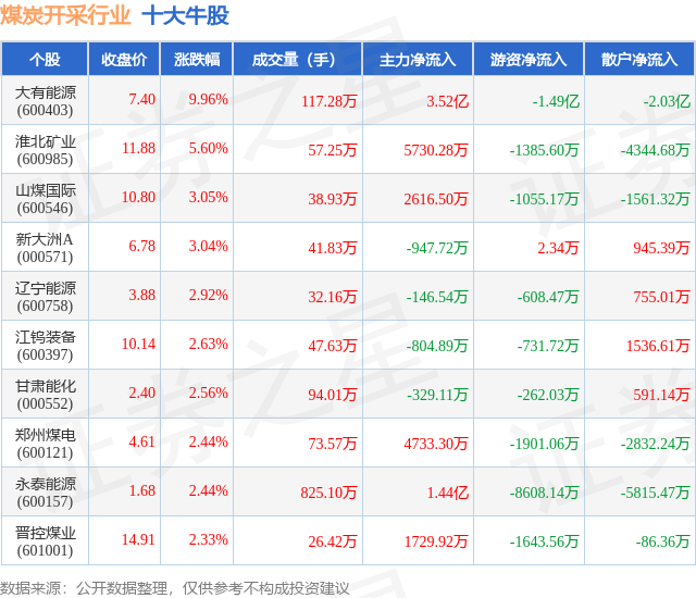 个股表现方面,煤炭开采行业当日领涨股为大有能源(600403),该股当日报收7.4,上涨9.96%,成交量117.28万,主力资金净流入3.52亿元。淮北矿业(600985)以上涨5.6%紧随其后,该股当日成交量57.25万,主力资金净流入5730.28万元。除此之外,山煤国际(600546)、新大洲A(000571)、辽宁能源(600758)均进入当日牛股之列。具体个股列表见下表: