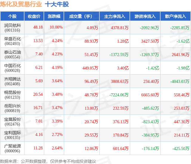 个股表现方面,炼化及贸易行业当日领涨股为润贝航科(001316),该股当日报收48.18,上涨10.0%,成交量4.09万,主力资金净流入4378.81万元。荣盛石化(002493)以上涨4.24%紧随其后,该股当日成交量88.93万,主力资金净流入1.28亿元。除此之外,泰山石油(000554)、中国石化(600028)、齐翔腾达(002408)均进入当日牛股之列。具体个股列表见下表: