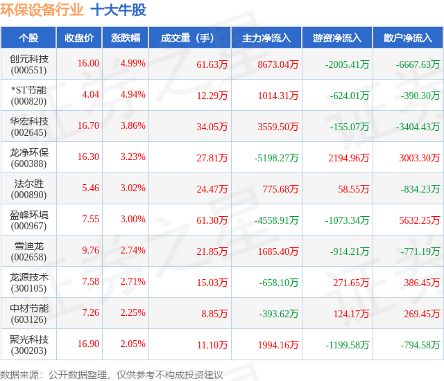 个股表现方面,环保设备行业当日领涨股为创元科技(000551),该股当日报收16.0,上涨4.99%,成交量61.63万,主力资金净流入8673.04万元。*ST节能(000820)以上涨4.94%紧随其后,该股当日成交量12.29万,主力资金净流入1014.31万元。除此之外,华宏科技(002645)、龙净环保(600388)、法尔胜(000890)均进入当日牛股之列。具体个股列表见下表: