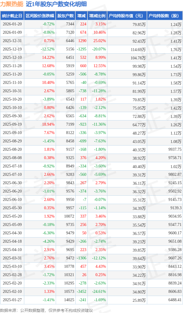 证券之星消息,近日力聚热能披露,截至2026年1月20日公司股东户数为7344.0户,较1月9日增加224.0户,增幅为3.15%。户均持股数量由上期的1.28万股减少至1.24万股,户均持股市值为79.85万元。