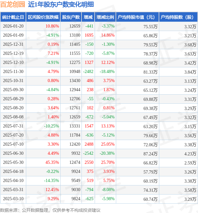 证券之星消息,近日百龙创园披露,截至2026年1月20日公司股东户数为1.27万户,较1月9日减少441.0户,减幅为3.37%。户均持股数量由上期的3.21万股增加至3.32万股,户均持股市值为75.55万元。