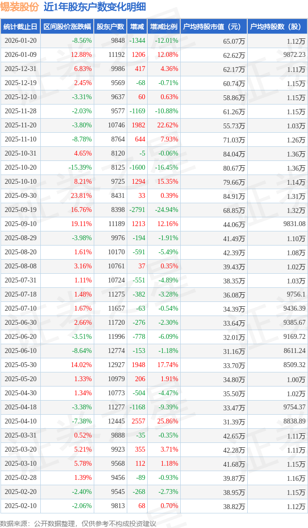 从股价来看,2026年1月9日至2026年1月20日,锡装股份区间跌幅为8.56%,在此期间股东户数减少1344.0户,减幅为12.01%。