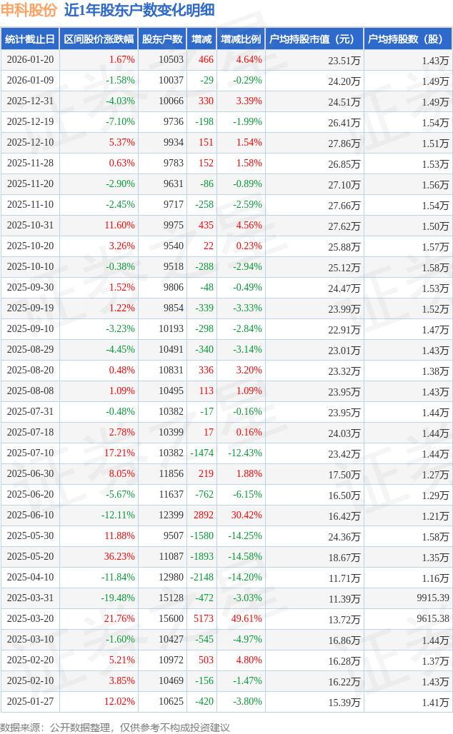 从股价来看,2026年1月9日至2026年1月20日,申科股份区间涨幅为1.67%,在此期间股东户数增加466.0户,增幅为4.64%。