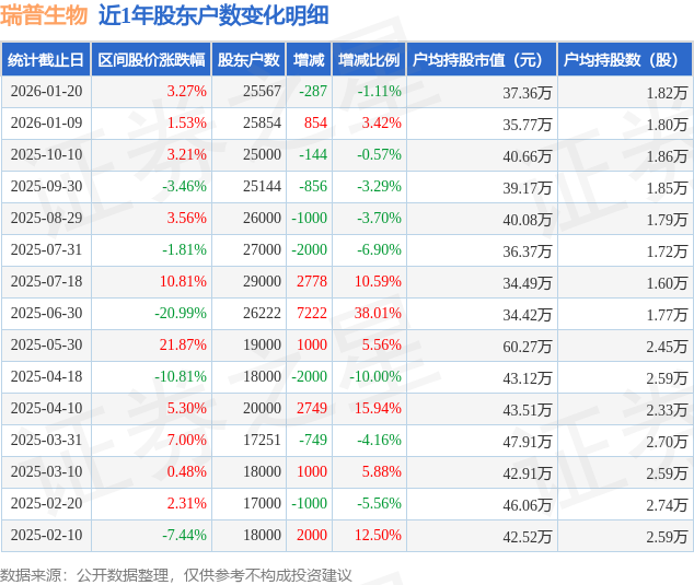证券之星消息,近日瑞普生物披露,截至2026年1月20日公司股东户数为2.56万户,较1月9日减少287.0户,减幅为1.11%。户均持股数量由上期的1.8万股增加至1.82万股,户均持股市值为37.36万元。