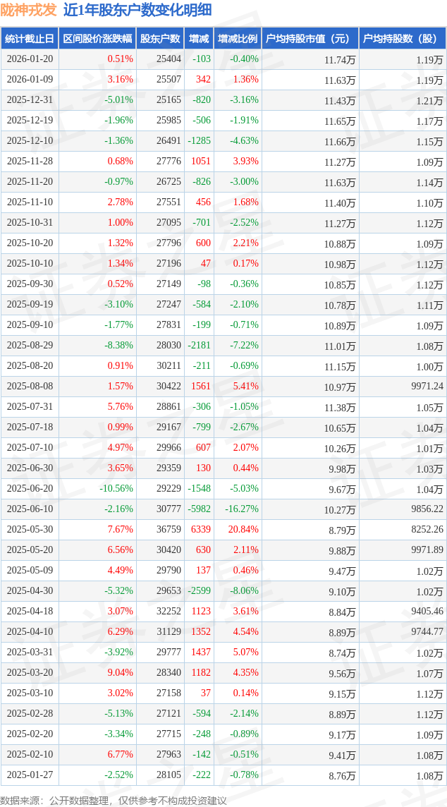 从股价来看,2026年1月9日至2026年1月20日,陇神戎发区间涨幅为0.51%,在此期间股东户数减少103.0户,减幅为0.4%。