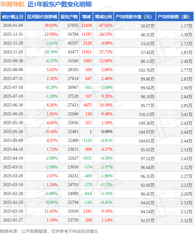 从股价来看,2025年11月28日至2026年1月9日,华测导航区间涨幅为38.03%,在此期间股东户数增加2.14万户,增幅为47.02%。