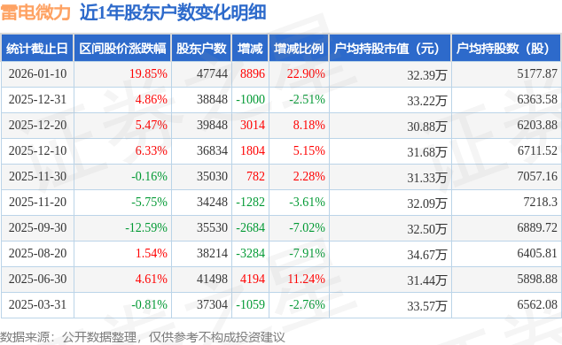 证券之星消息,近日雷电微力披露,截至2026年1月10日公司股东户数为4.77万户,较12月31日增加8896.0户,增幅为22.9%。户均持股数量由上期的6364.0股减少至5178.0股,户均持股市值为32.39万元。