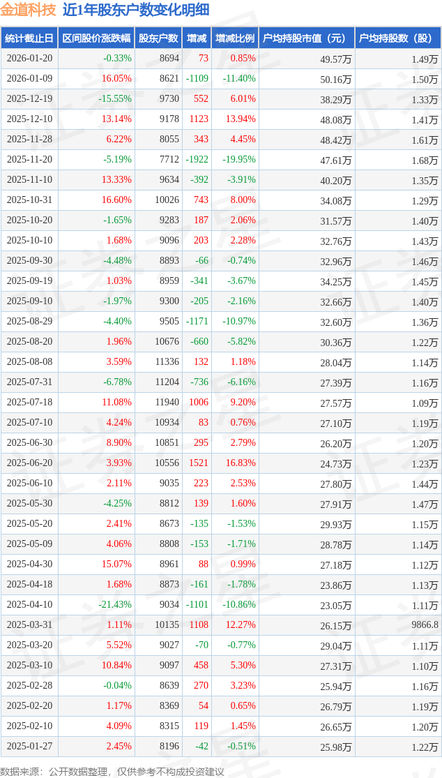从股价来看,2026年1月9日至2026年1月20日,金道科技区间跌幅为0.33%,在此期间股东户数增加73.0户,增幅为0.85%。